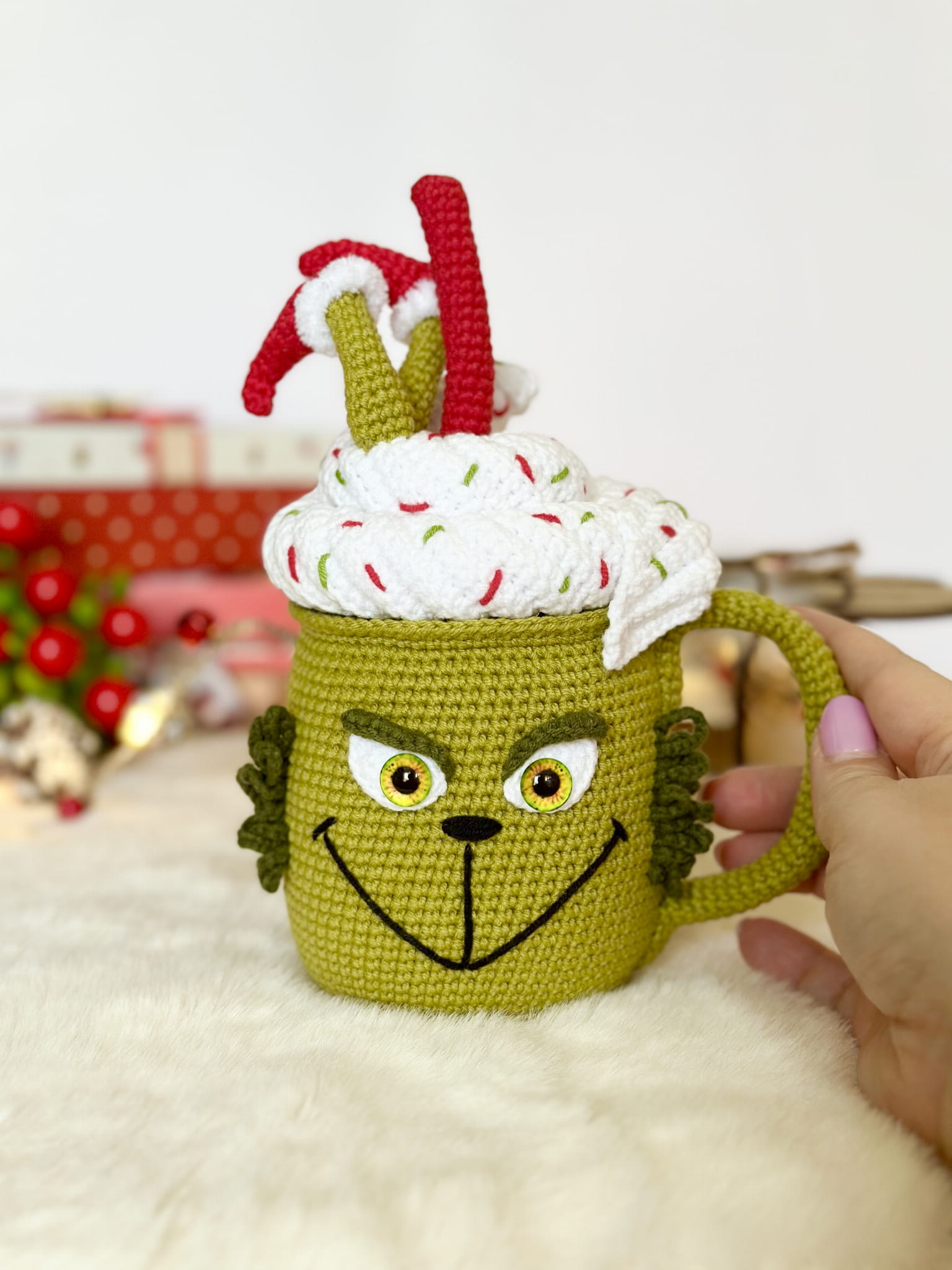 Rękodzieło - Grinch kubek wykonany szydełkiem