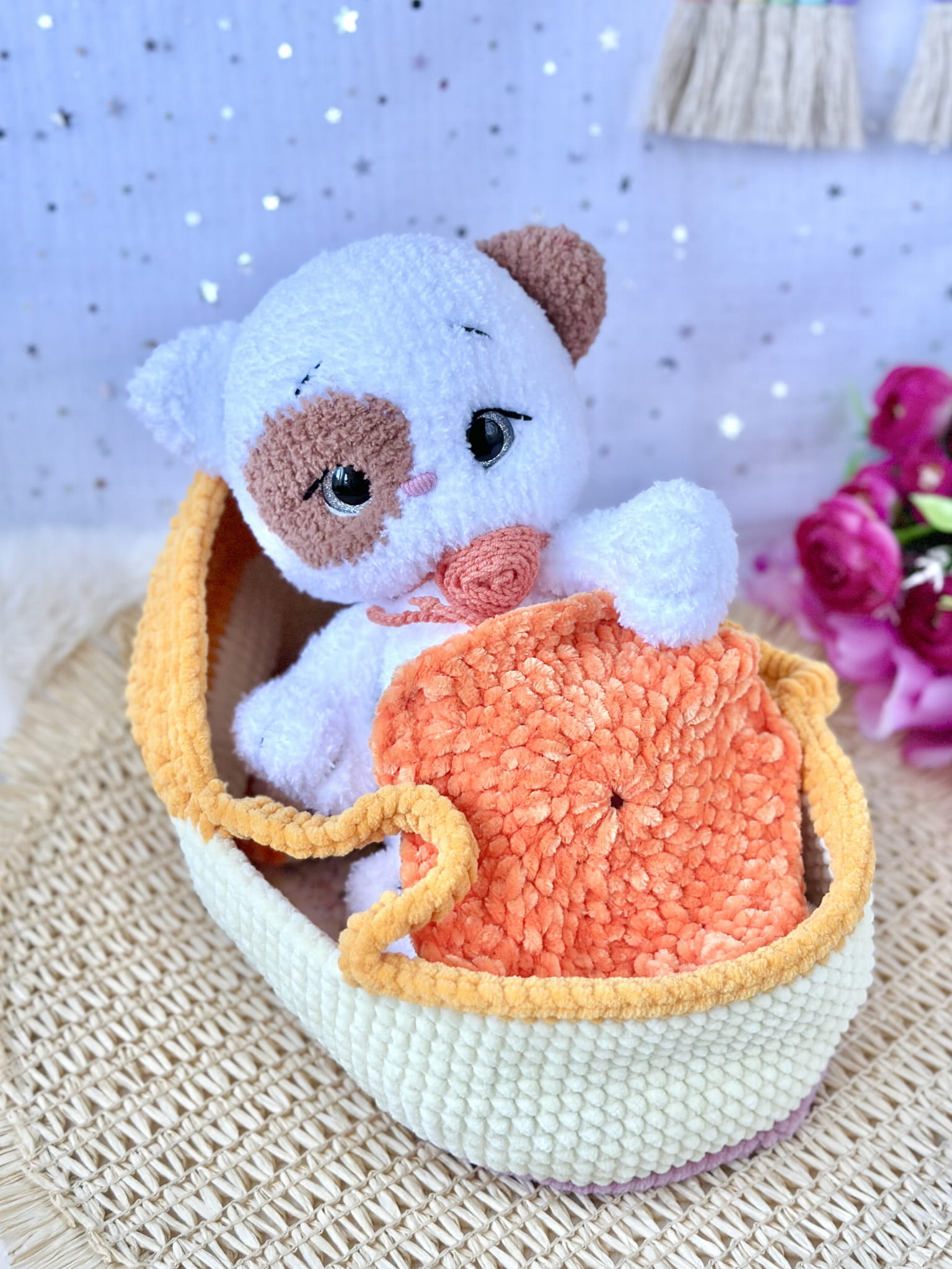 Rękodzieło - kot w kołysce wykonany na szydełkiem