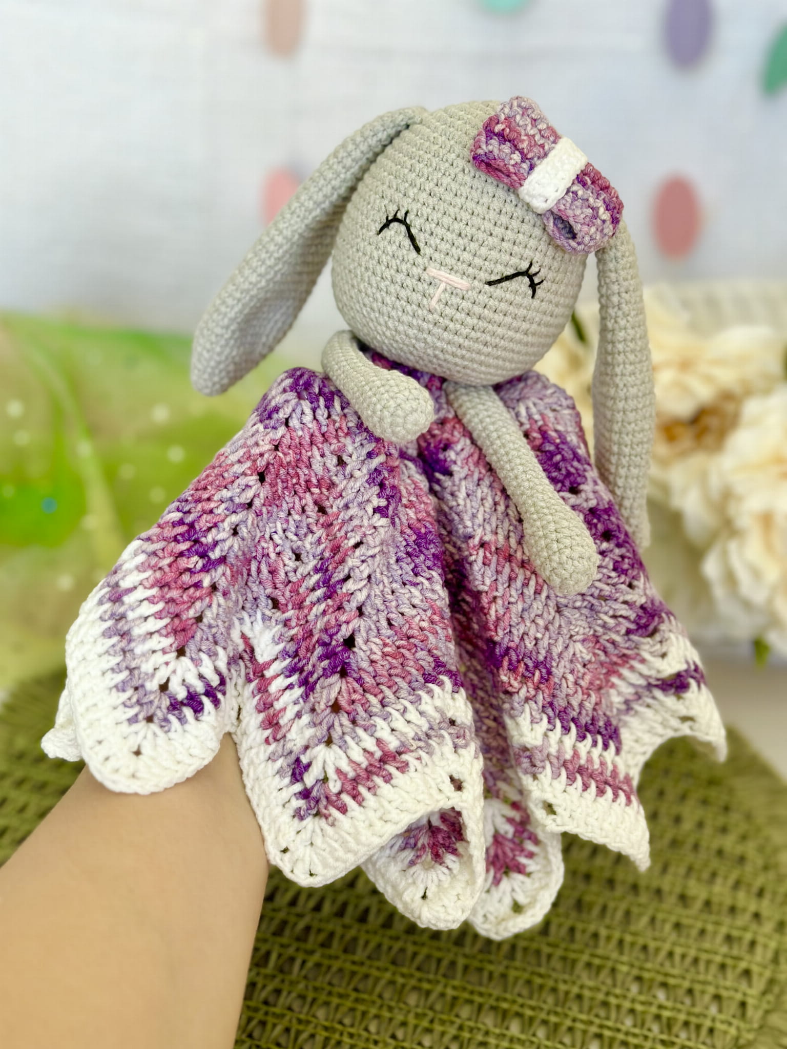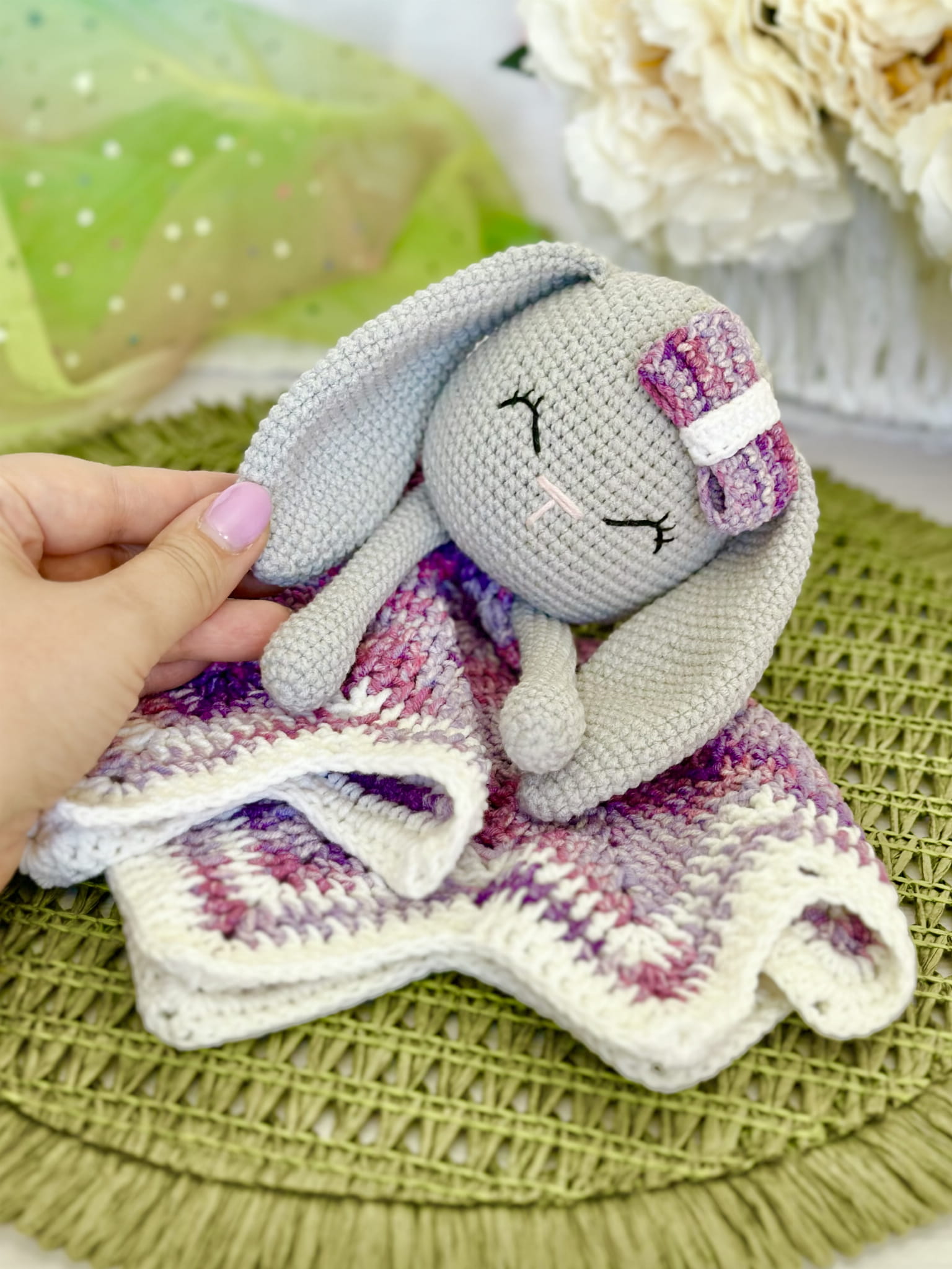 Rękodzieło - królik komforter kocyczek wykonany szydełkiem