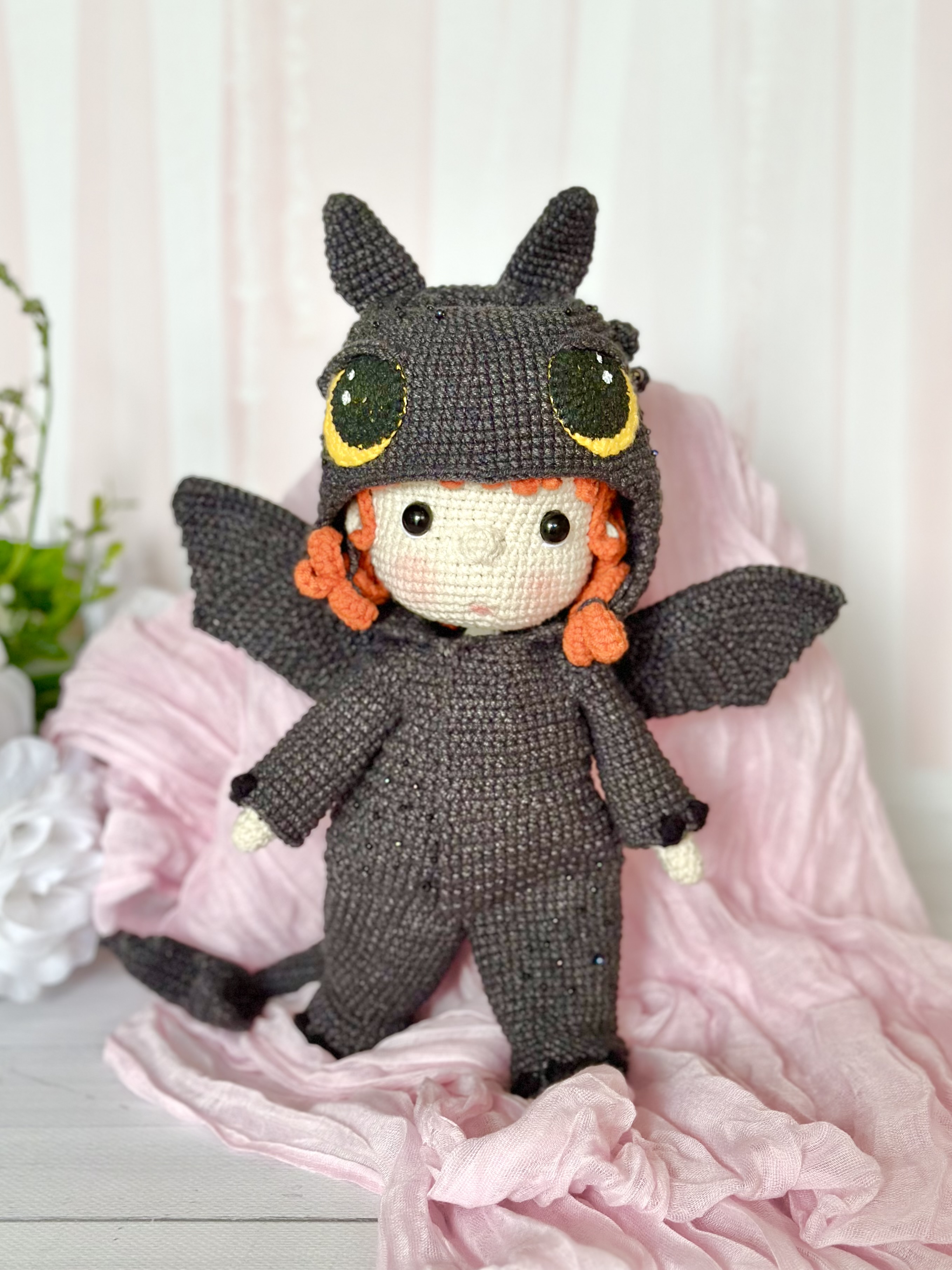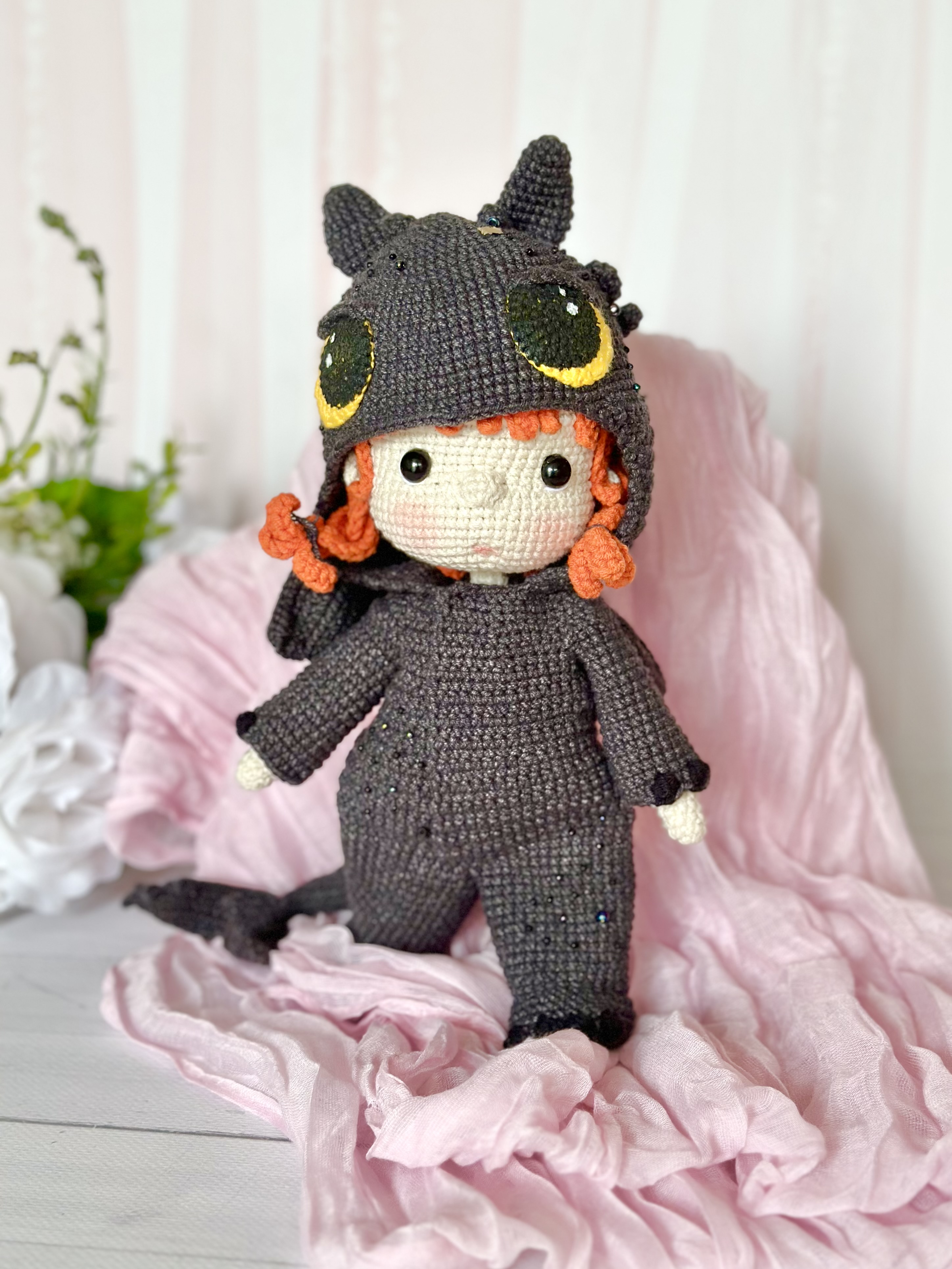 Rękodzieło - lalka w kostiumie smoka wykonana szydełkiem