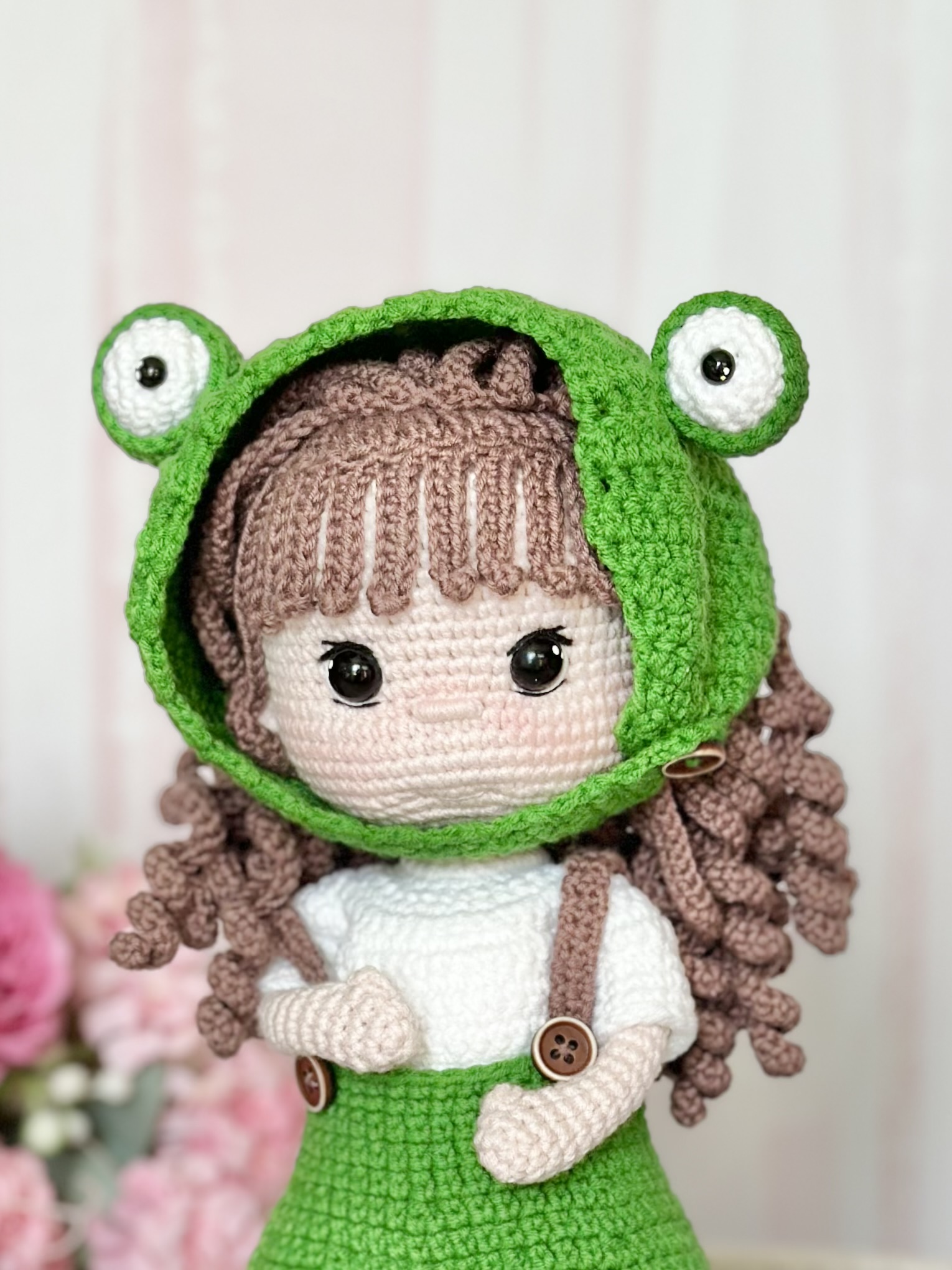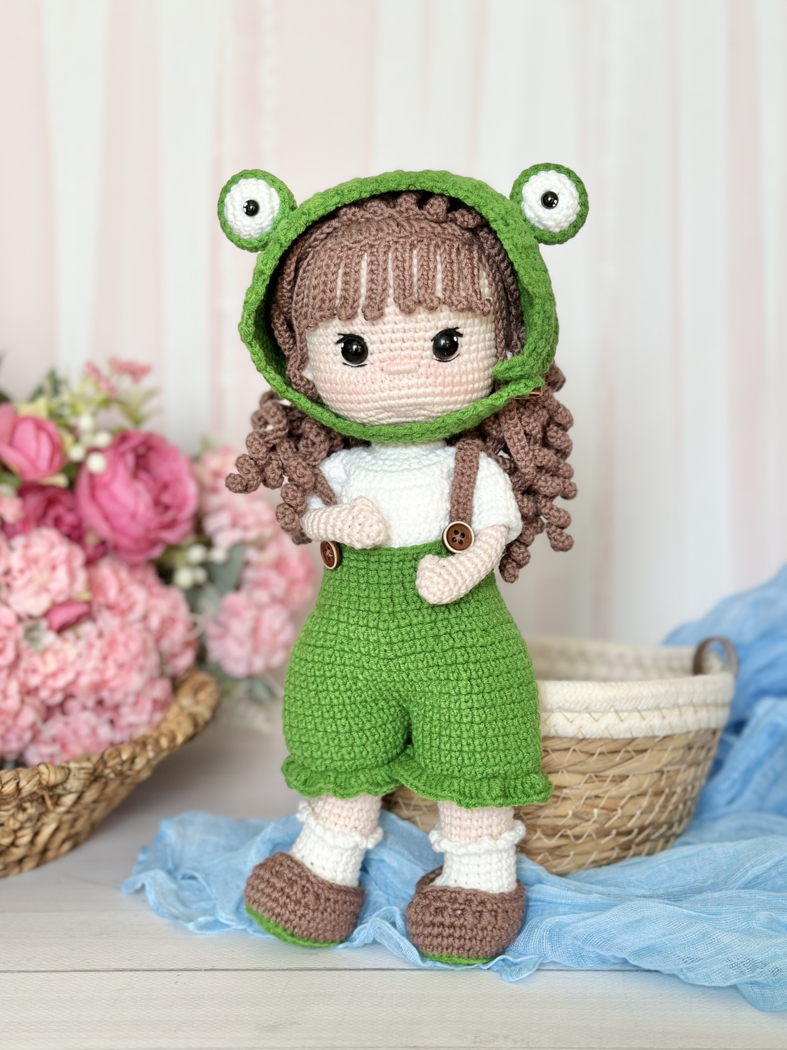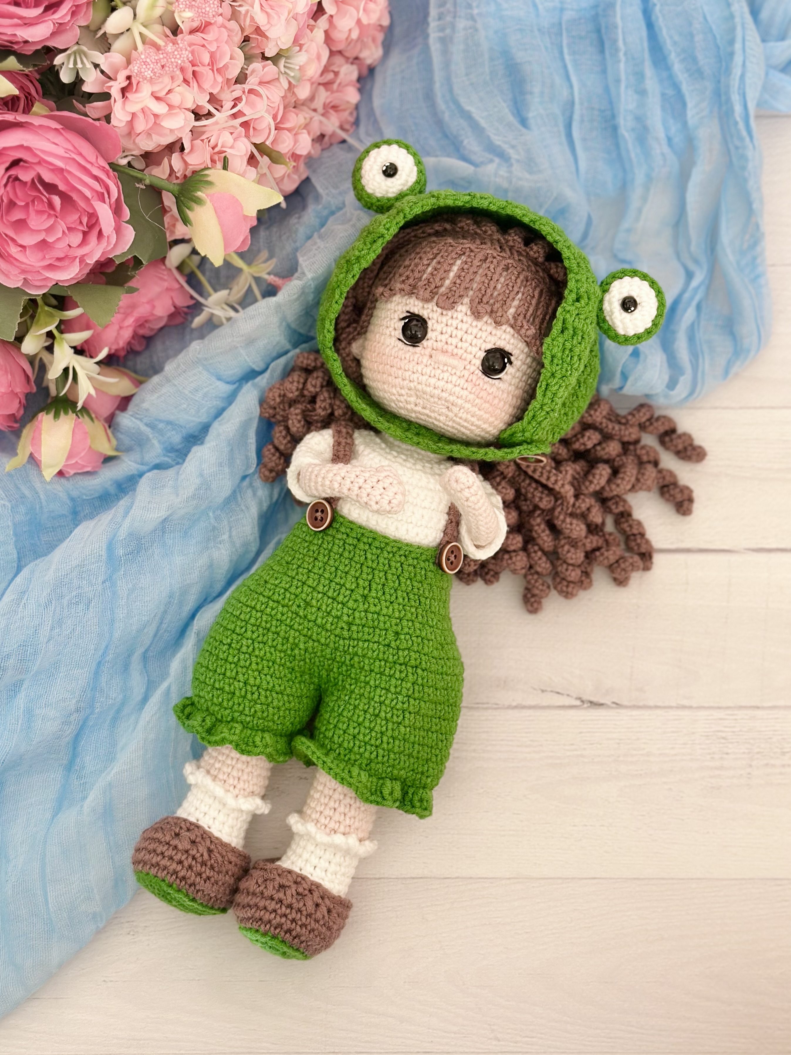 Rękodzieło - lalka w kostiumie żaby wykonana szydełkiem