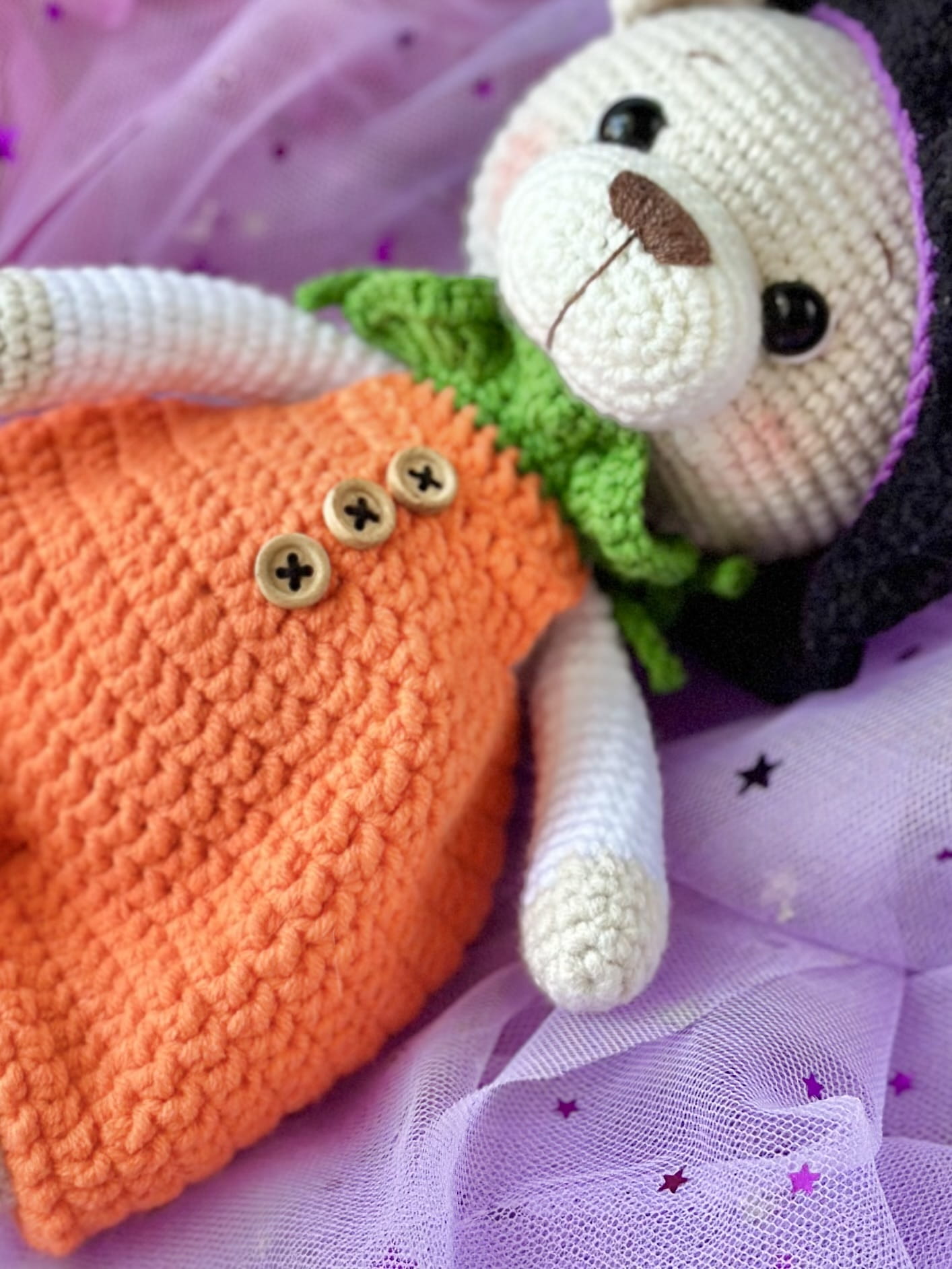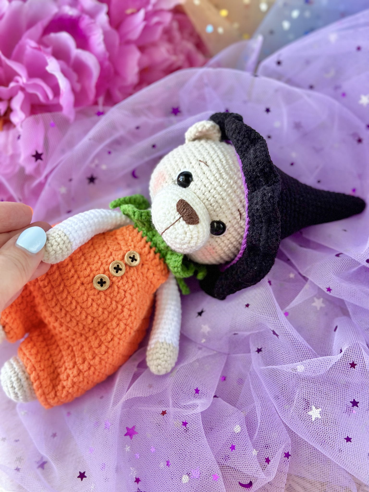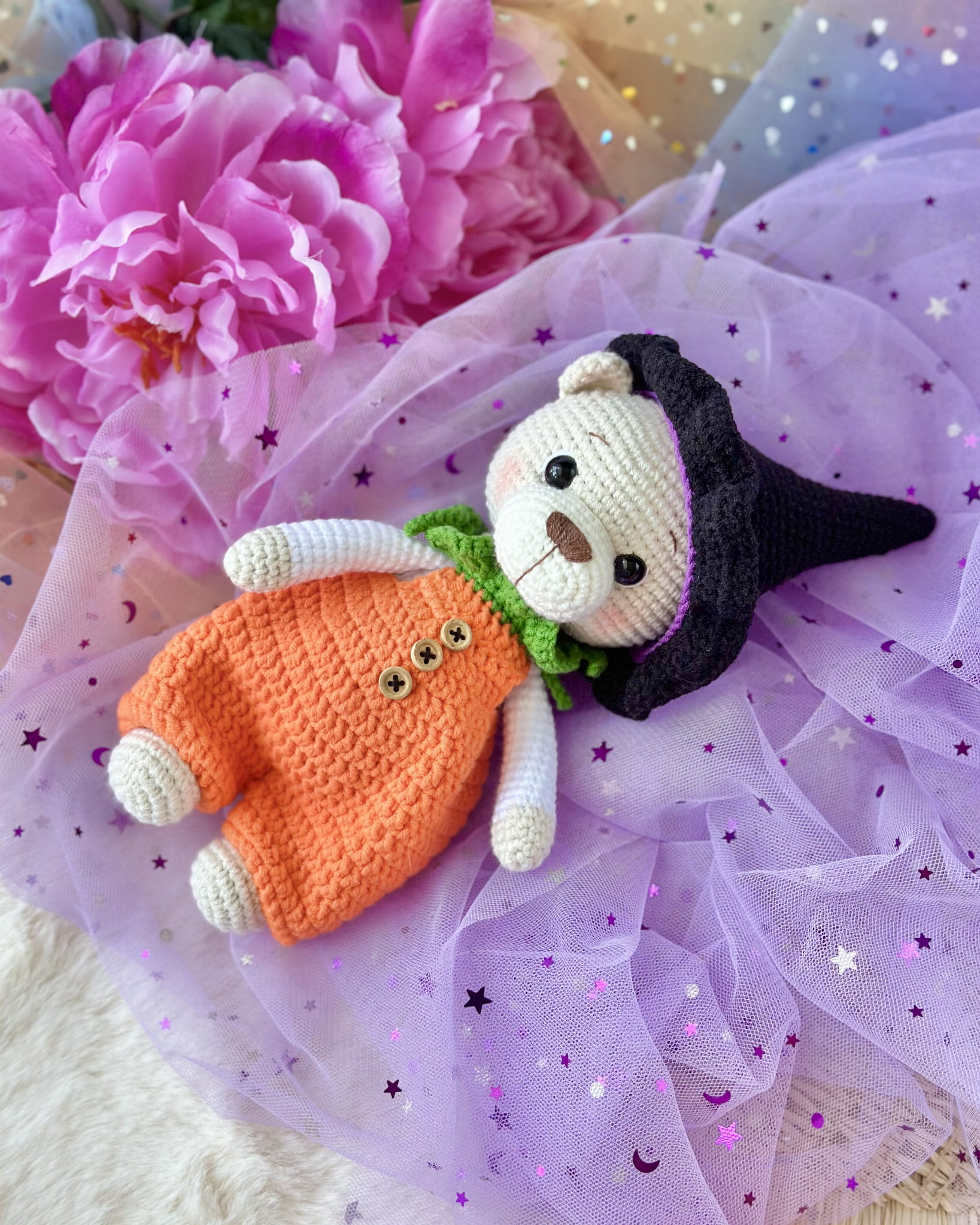 Rękodzieło - miś w stroju dyni/czarownicy wykonany na szydełku